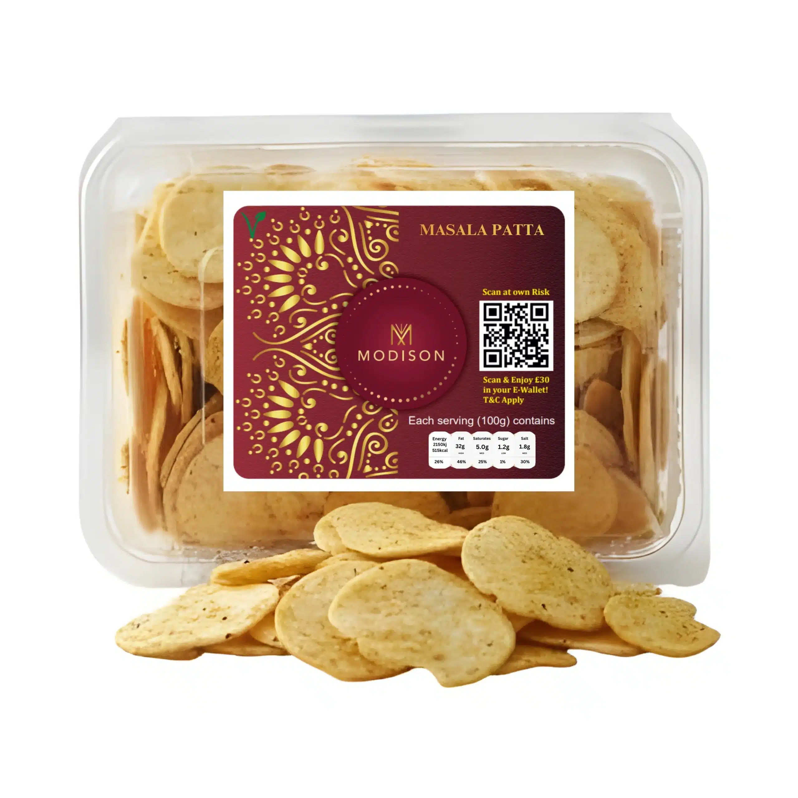 - PRODUCT TYPE: Crispy masala-flavoured potato wafers, perfect for Indian snacking, packaged in a 180g clear plastic container