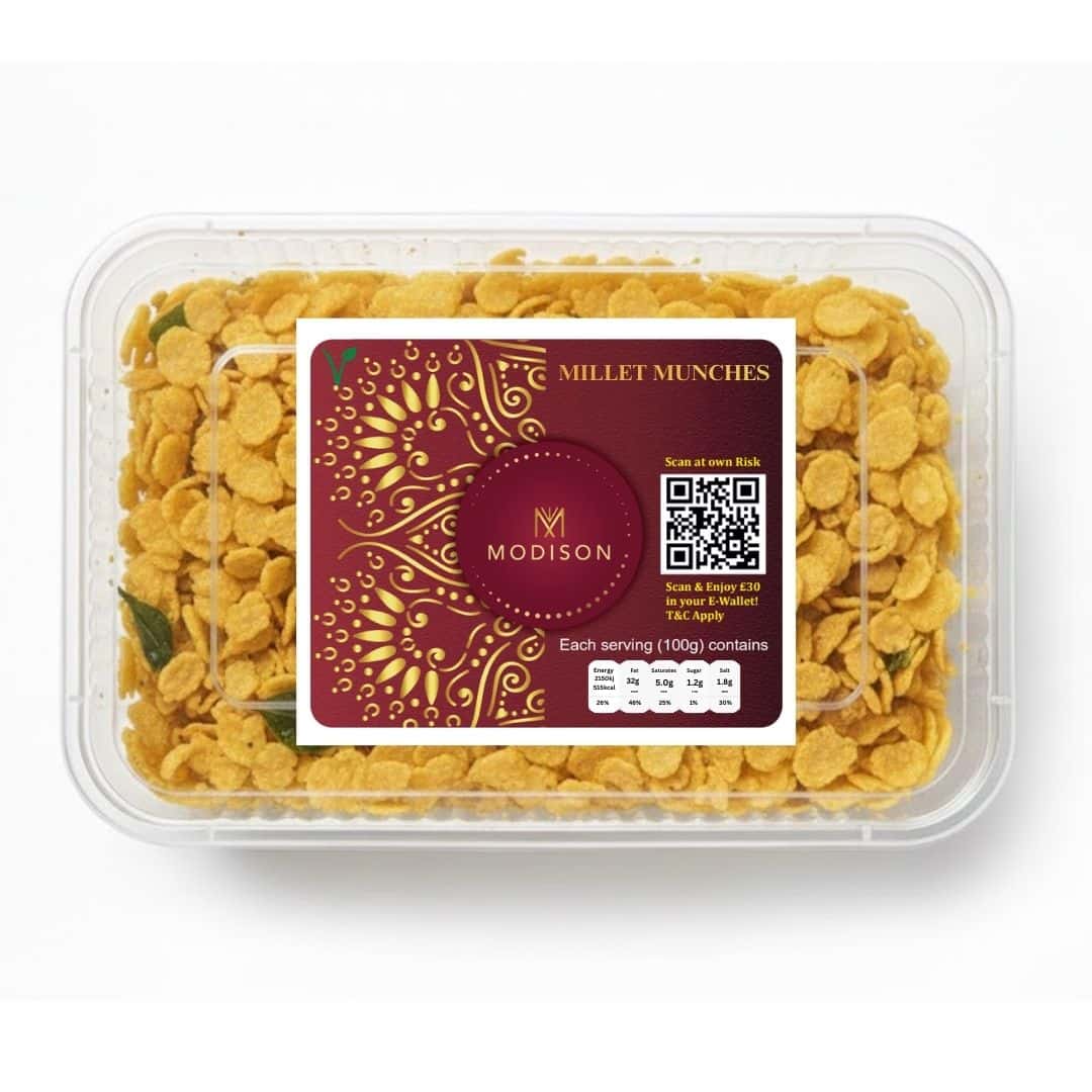 MODISON MILLET MUNCH | Authentic Indian Snack | Vegetarian | Exported from India | UK ApprovedPremium quality MILLET MUNCH from MODISON – India’s trusted exporter.100% Vegetarian, made with traditional Indian ingredients.Sealed packaging to preserve freshness during export.Imported & distributed in the UK by PRS Imports Ltd, Leicester.Long shelf life | Store in a cool, dry place | Allergen info on pack.