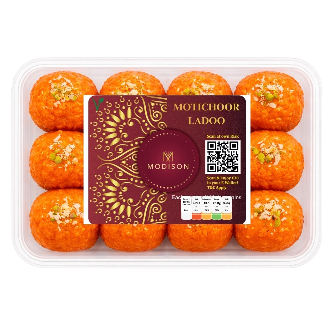 Modison Motichoor Laddu is a premium quality authentic Indian sweet crafted from delicate boondi pearls and pure ghee to deliver rich flavour and soft texture in every bite. Known for its vibrant colour and melt-in-the-mouth consistency, this traditional mithai is a favourite for festive celebrations and religious occasions. Moreover, it is prepared under hygienic conditions to ensure freshness and superior quality. Whether for Diwali, weddings, or family gatherings, Modison Motichoor Laddu brings authentic Indian sweetness to homes across the UK.