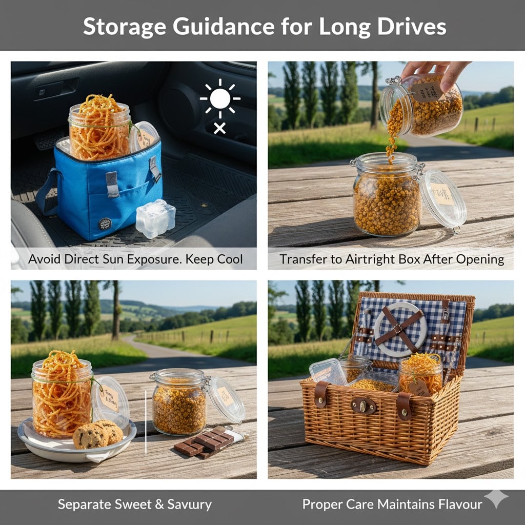Indian snacks naturally meet many of these requirements. Many traditional namkeen were originally designed for storage and long travel — making them perfect for modern UK drives.